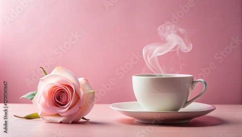 A steaming cup of tea and a delicate pink rose on a pink surface