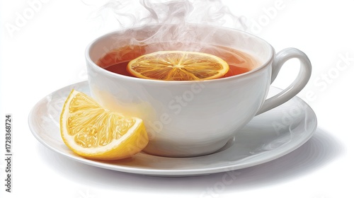 A steaming cup of tea with lemon slice floating inside and another lemon wedge on a saucer, set against a stark white background
