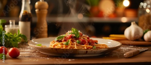 A steaming plate of spaghetti topped with tomato sauce, fresh basil, and grated cheese on a wooden table with various ingredients and cooking utensils in the background