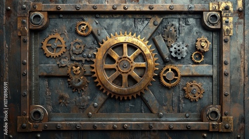 A steampunk-inspired mechanical backdrop featuring intricate gears and cogs.