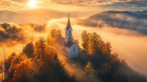 sunrise, church, hill, fog, forest, mountain, tree, sky, cloud, light, nature, landscape, travel, scenic, beautiful, gold, autumn, aerial, drone, peaceful, mystical, spirituality, faith, hope, religion, architecture, landmark, destination, season, weather, morning, calmness