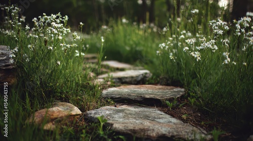 A stone path winds through lush green grass and delicate white wildflowers in a peaceful, natural setting