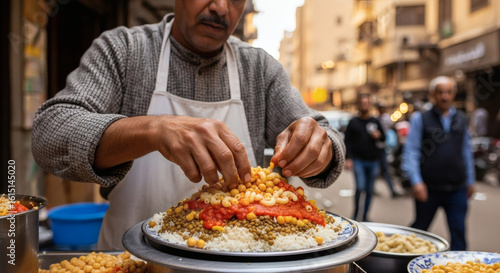 A street food vendor in a bustling city carefully prepares a traditional plate of Egyptian koshary.