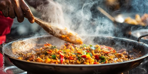 a street food vendor preparing a dish, sizzling ingredients and vibrant spices creating an irresistible aroma