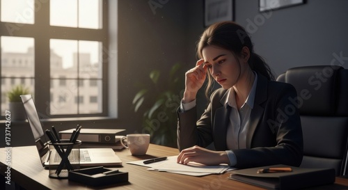 A stressed businesswoman sits at her office desk, contemplating documents with a laptop and coffee nearby, bathed in soft window light.