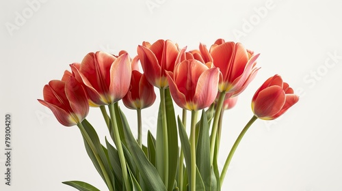 A striking bunch of tulip flowers stands out against a clean white backdrop A stunning red tulip complete with its stem and leaves takes center stage in a captivating close up shot This nat