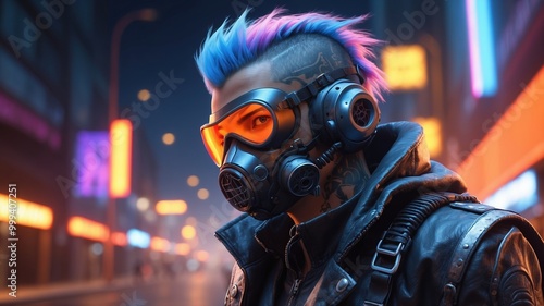 futuristic, urban, adventurer, neon, street, dusk, vibrant, hair, gas, mask, city, technology, night, fashion, style, edgy, cool, adventure, glow, light, modern, character, aesthetic, nightlife, purple, blue, leather, jacket, creative, atmosphere, bold, alternative, unique, edge, individuality, culture, rebel, fantasy, ambient, design, digital, art, imaginative, exploration