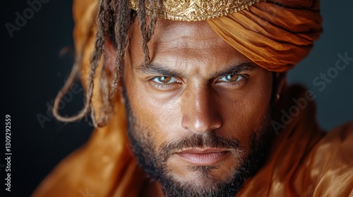 A striking portrait of a man adorned in rich fabrics and a turban, embodying power, culture, and nobility with an intense, captivating gaze.