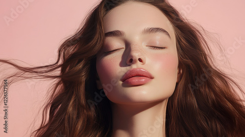 A striking portrait of a woman with long flowing hair, closed eyes, her face caressed by soft natural light