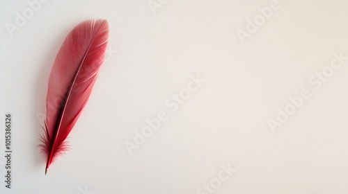 A striking red feather quill lies on a smooth white parchment, showcasing its delicate barbs and creating an inviting atmosphere for writing, with ample space for notes or compositions