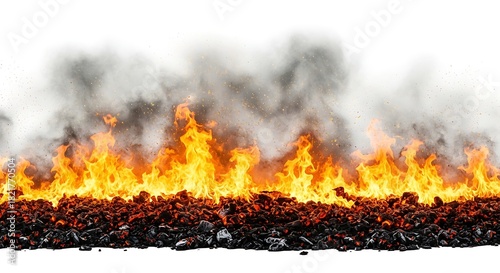 A strip of intense fire with bright orange flames and dark smoke rising from a bed of burning embers on a white background