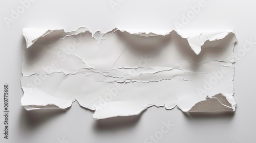 A strip of white paper with torn edges and visible textures, capturing the raw, organic, and untouched nature of torn materials, and the clean white space around.