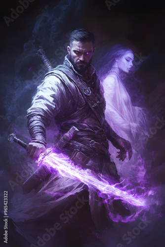 A strong looking mage in his thirties with a short beard, wielding a short sword glowing with dark purple energy