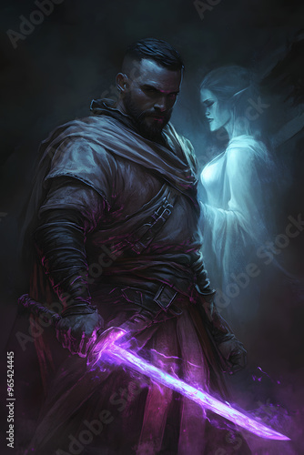 A strong looking mage in his thirties with a short beard, wielding a short sword glowing with dark purple energy