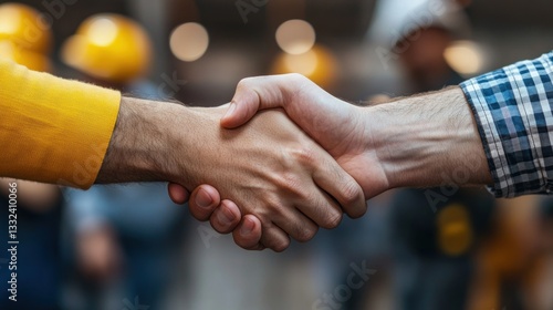 A Strong Partnership: Two Hands Clasped in a Firm Handshake, Symbolizing Collaboration, Trust, and Agreement in a Busy Industrial Setting