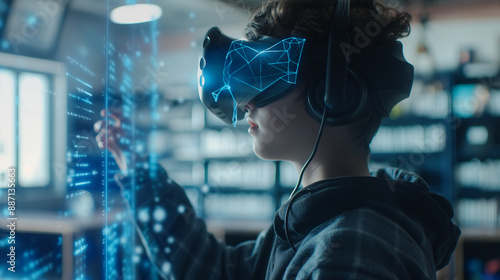A student wearing a VR headset in a classroom, interacting with AI-generated blue holograms that teach coding and programming concepts.