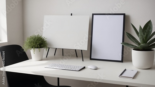 A study or a small office room interior design with decoratives, accessories and a black poster frame mock-up on the wall 3d illustration.
