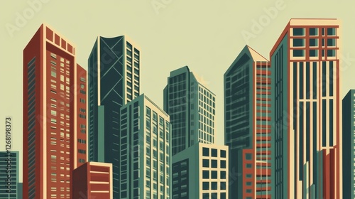 A stunning 2D flat skyline showcases Art Deco architecture, with sleek skyscrapers and bold geometric designs in soft hues.