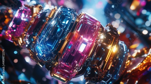 crystal, gemstone, abstract, colourful, vibrant, geometric, shiny, polished, reflective, prism, refractive, light, illumination, glow, depth, dimension, transparent, facet, texture, surface, design, art, composition, creative, modern, intricate, radiant, luminescent, iridescent, structure, architecture, detail, gem, metallic, gold, blue, pink, purple, orange, elegant, luxurious, fantasy, futuristic, cyber, digital, rendered, macro, close
