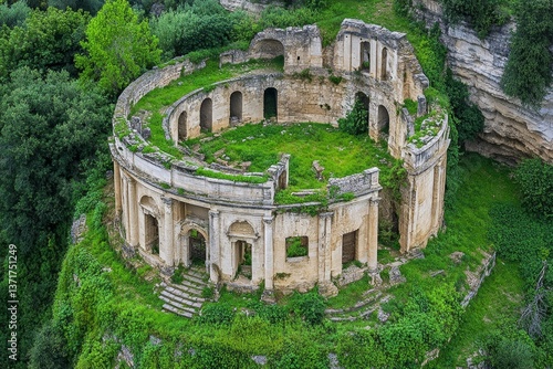 A stunning aerial view of the ruins of an ancient amphitheater, partially reclaimed by nature