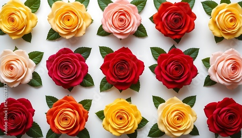 A stunning arrangement of twelve vibrant artificial roses in a grid pattern, showcasing a variety of colors including red, yellow, orange, and pink.