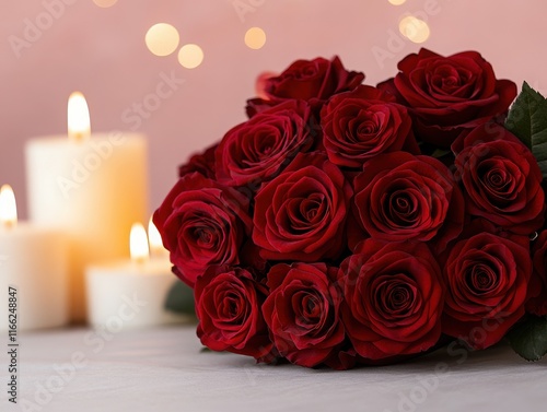 A stunning bouquet of red roses surrounded by soft candlelight, creating an enchanting atmosphere for romance and celebration.