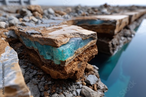 A stunning close-up of a geode showcasing vibrant aquamarine crystals encased in rock, highlighting natural beauty and geological formations in a serene setting.