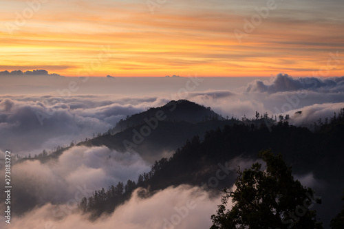 A stunning colorful mountain sunset or sunrise on campsite 7 mount Raung. Raung is the most challenging of all Java’s mountain trails, and the most active volcanoes on the island of Java Indonesia.