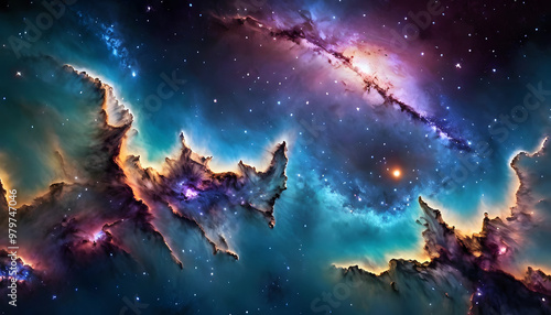 A stunning cosmic scene featuring vibrant colors and intricate patterns of nebulae and galaxies. The image showcases swirling clouds of gas and dust illuminated by distant stars.