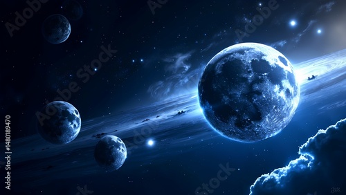 A stunning digital illustration of several planets and moons in deep space, surrounded by stars and cosmic clouds in a blue-hued galaxy scene.