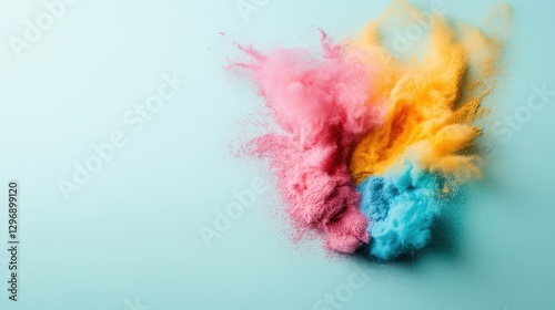 A stunning explosion of colorful powders captured in motion, creating an artistic display that showcases vibrant hues and dynamic energy against a soft backdrop.