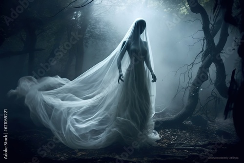 A stunning female ghost in a wedding dress. Created with Generative Ai technology.