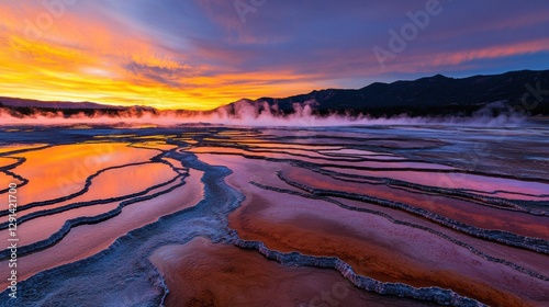 natural, hot, spring, peaceful, landscape, geothermal, sunset, colours, mineral, wonder, pattern, serenity, calmness, unique, steam, exploration, wellness, mist, vista, tranquil, atmosphere, vibrant, heat, photo, relaxation, earth, horizon, wildlife, scenery, ecosystem, picturesque, geology, scenic, breathtaking, terrain, formation, yellowstone, sky, pool, beauty, nature, adventure, environment, hot spring, travel, tour tourism