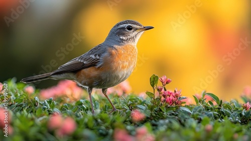 bird, nature, wildlife, animal, avian, fauna, feather, wing, beak, garden, flower, bloom, blossom, plant, flora, foliage, shrub, bush, green, pink, orange, yellow, colourful, vibrant, bright, sunlight, light, day, spring, summer, beauty, serenity, peaceful, calm, macro, photo, closeup