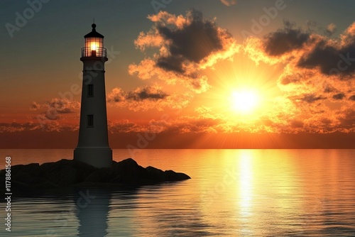 A stunning image of a lighthouse standing tall against a vibrant sunset, casting its light over calm water. This serene scene showcases natural beauty and tranquility.