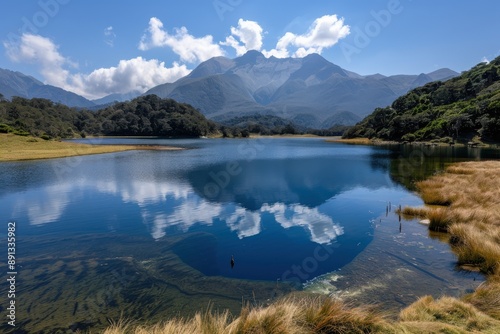 A stunning lake with clear waters reflecting the surrounding mountains and a blue sky with scattered clouds. The scene is tranquil, giving off a sense of peace and serenity.