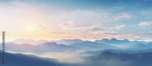 A stunning landscape of mountains with a vibrant sunset and sun rays creating a special circular area for text The image includes a blurred effect for copy space