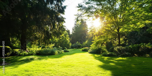 A stunning landscape photo of a sunlit meadow in a green forest