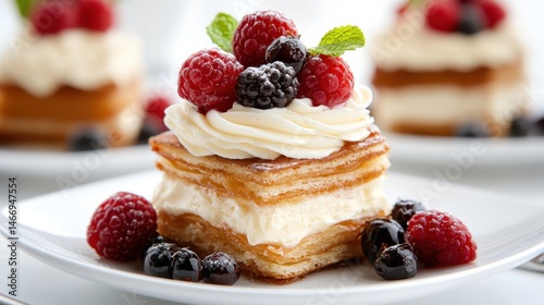 A stunning layered dessert showcasing crispy pastry, creamy filling, and an array of fresh raspberries and blackberries, ideal for any delicious treat or sweet celebration.