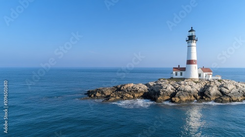 A stunning lighthouse stands proudly on a rocky coast, overlooking the blue ocean under a clear sky