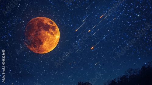 A stunning orange moon illuminates a starry night with shooting stars in the sky