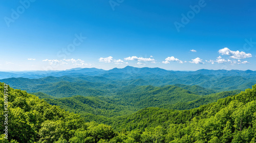 A stunning panoramic view of lush green mountains under a bright blue sky, showcasing nature's beauty and tranquility.
