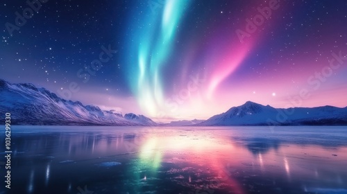 A stunning scene featuring vibrant auroras dancing over a serene lake, surrounded by snow-capped mountains under a starry sky illuminating a mesmerizing twilight.