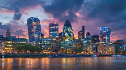 A stunning skyline view of London's modern architecture illuminated at dusk, reflecting on the river.