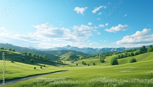 A stunning spring day landscaping views of fertile land surrounded beautiful green vegetation, wide stretches of hills and mountains with clear skies in spring