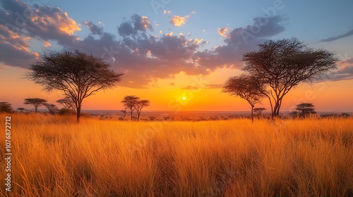 A stunning sunset over the African savanna, casting a golden glow on the tall grass and silhouetting acacia trees against the vibrant sky.
