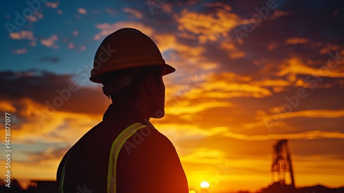 A stunning sunset silhouettes a civil engineer's hard hat, capturing the essence of construction.