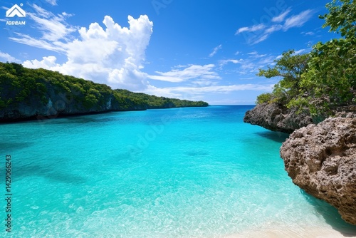 A stunning tropical beach scene featuring turquoise waters, lush greenery, and dramatic cliffs under a bright blue sky.