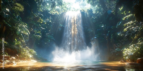 A stunning tropical waterfall cascading into a serene pool, surrounded by dense lush greenery with sunlight filtering through the trees, creating a tranquil atmosphere.