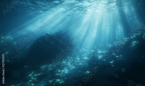 A stunning underwater image of a mysterious shipwreck, showcasing intricate details and vibrant marine life.
